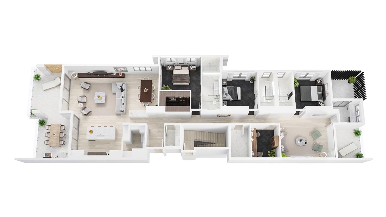 A 3D Exterior Render of your residential development can showcase to buyers your plan’s potential. Our photo-realistic architectural visualizations show off façade, landscaping, light fittings, and street appeal. Available for Single Property, Duplex, Streetscape, Large, Grand, and Custom Projects.